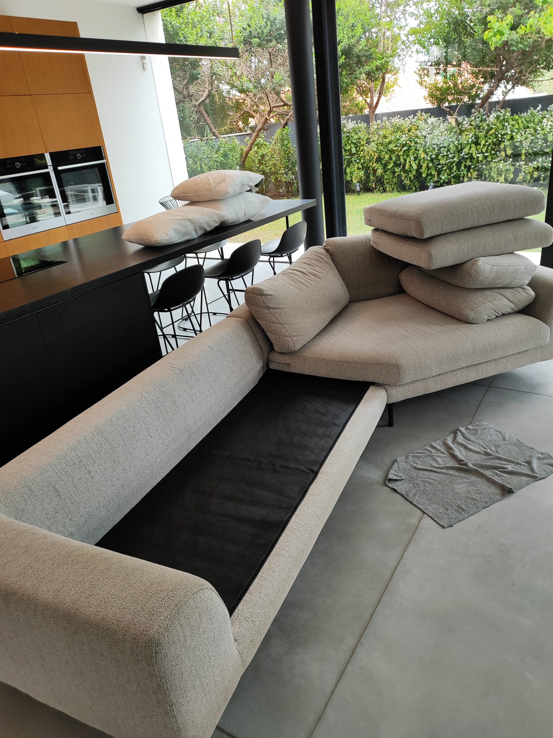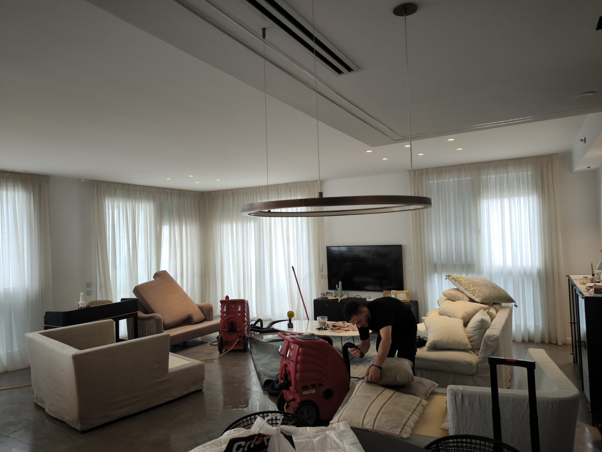 השירות כולל פירוק, ניקוי מקצועי יבש או רטוב בהתאם לסוג הבד, ייבוש ותלייה מחדש – הכל אצלך בבית, בלי צורך להזיז כלום.
